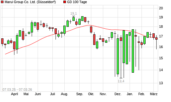 Mit dem Anstieg auf 17,20 EUR hat die Marui Group-Aktie am 06.03.2026 die 100-Tage-Linie nach oben gekreuzt.