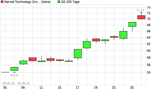 Mit dem Anstieg auf 71,90 EUR hat die Marvell Technlogy Group-Aktie am 25.09.2025 die 200-Tage-Linie nach oben gekreuzt.