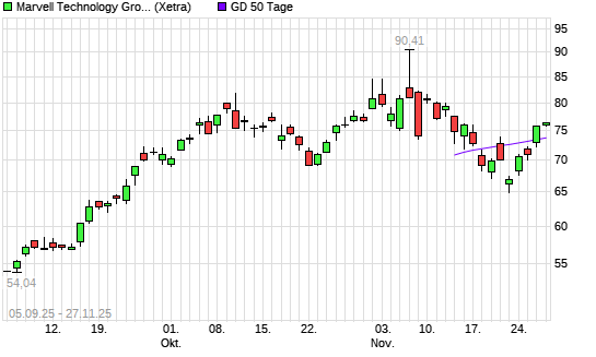Mit dem Anstieg auf 77,11 EUR hat die Marvell Technlogy Group-Aktie am 26.11.2025 die 50-Tage-Linie nach oben gekreuzt.