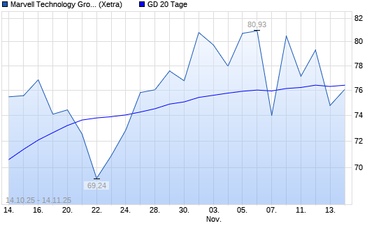 Mit dem Rücksetzer auf 75,09 EUR hat die Marvell Technlogy Group-Aktie am 13.11.2025 die 20-Tage-Linie nach unten gekreuzt.