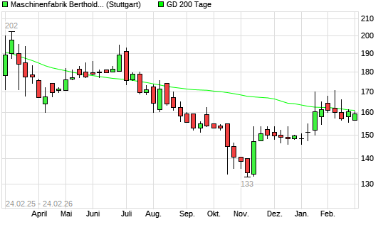 Mit dem Rücksetzer auf 159,00 EUR hat die Maschinenfabrik Berthold Hermle Vz-Aktie am 23.02.2026 die 200-Tage-Linie nach unten gekreuzt.