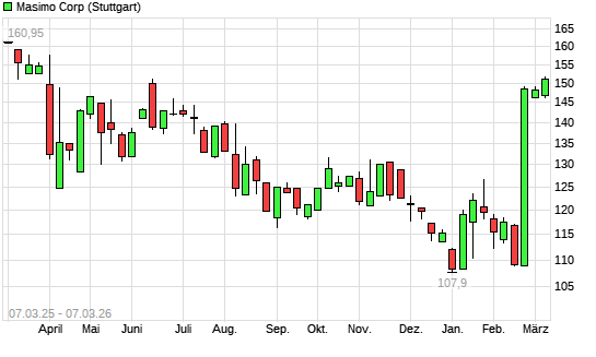 Mit dem Anstieg auf 150,85 EUR hat die Masimo-Aktie (ISIN US5747951003) am 06.03.2026 ein neues 6-Monats-Hoch erreicht und damit den Kurs vom 05.03.2026 eingestellt.
