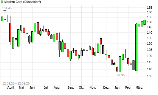 Mit dem Anstieg auf 151,25 EUR hat die Masimo-Aktie (ISIN US5747951003) am 11.03.2026 ein neues 6-Monats-Hoch erreicht und damit den Kurs vom 06.03.2026 eingestellt.