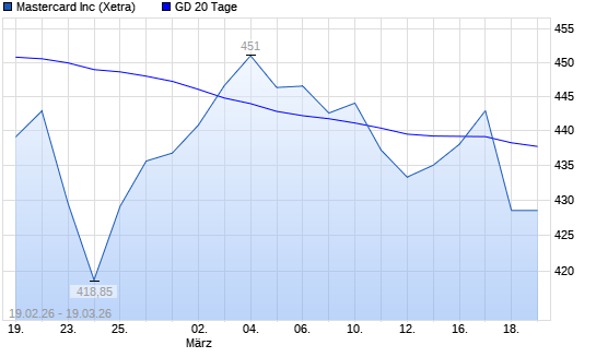 Mit dem Rücksetzer auf 425,95 EUR hat die Mastercard-Aktie am 18.03.2026 die 20-Tage-Linie nach unten gekreuzt.