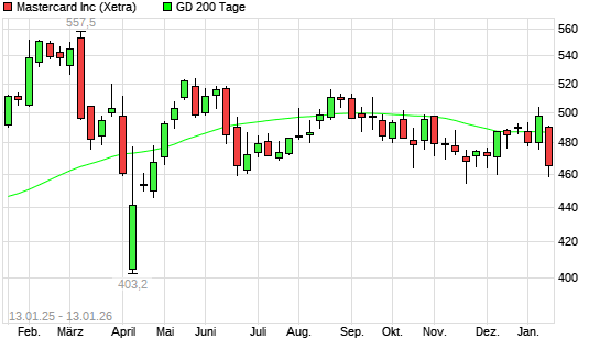 Mit dem Rücksetzer auf 483,50 EUR hat die Mastercard-Aktie am 12.01.2026 die 200-Tage-Linie nach unten gekreuzt.
