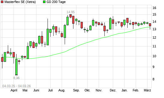 Mit dem Rücksetzer auf 13,05 EUR hat die Masterflex-Aktie am 03.03.2026 die 200-Tage-Linie nach unten gekreuzt.