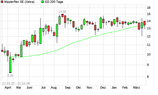 Mit dem Rücksetzer auf 13,25 EUR hat die Masterflex-Aktie am 20.03.2026 die 200-Tage-Linie nach unten gekreuzt.