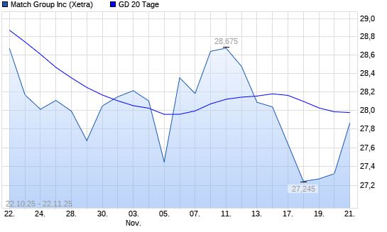 Mit dem Anstieg auf 28,08 EUR hat die Match Group-Aktie am 21.11.2025 die 20-Tage-Linie nach oben gekreuzt.