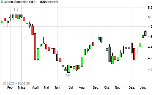 Mit dem Anstieg auf 4,66 EUR hat die Matsui Securities-Aktie (ISIN JP3863800003) am 09.01.2026 ein neues 6-Monats-Hoch erreicht und damit den Kurs vom 07.01.2026 eingestellt.