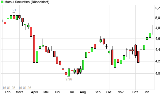 Mit dem Anstieg auf 4,74 EUR hat die Matsui Securities-Aktie (ISIN JP3863800003) am 15.01.2026 ein neues 6-Monats-Hoch erreicht und damit den Kurs vom 13.01.2026 eingestellt.