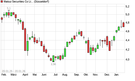 Mit dem Anstieg auf 4,76 EUR hat die Matsui Securities-Aktie (ISIN JP3863800003) am 19.01.2026 ein neues 6-Monats-Hoch erreicht und damit den Kurs vom 15.01.2026 eingestellt.