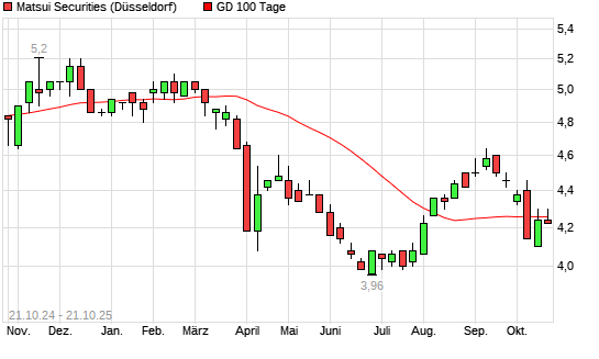 Mit dem Anstieg auf 4,26 EUR hat die Matsui Securities-Aktie am 20.10.2025 die 100-Tage-Linie nach oben gekreuzt.