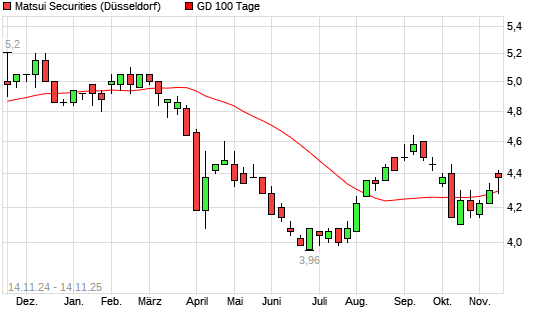 Mit dem Rücksetzer auf 4,24 EUR hat die Matsui Securities-Aktie am 13.11.2025 die 100-Tage-Linie nach unten gekreuzt.