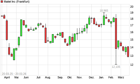 Mit dem Rücksetzer auf 12,90 EUR hat die Mattel-Aktie (ISIN US5770811025) am 19.03.2026 ein neues 6-Monats-Tief erreicht und damit den Kurs vom 18.03.2026 eingestellt.