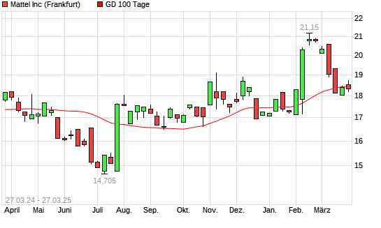 Die Mattel-Aktie befindet sich seit dem 23.12.2024 im langfristigen Aufwärtstrend und hat in diesem Zeitraum +6,54% an Wert gewonnen. Der Abstand zur 200-Tage-Linie beträgt aktuell +3,29%.