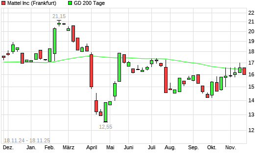 Mit dem Rücksetzer auf 16,16 EUR hat die Mattel-Aktie am 17.11.2025 die 200-Tage-Linie nach unten gekreuzt.