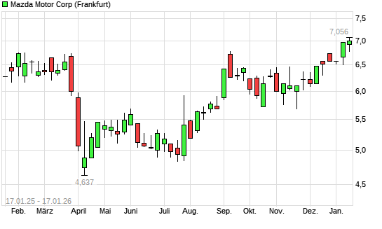 Mit dem Anstieg auf 7,00 EUR hat die Mazda Motor-Aktie (ISIN JP3868400007) am 16.01.2026 ein neues 12-Monats-Hoch erreicht und damit den Kurs vom 09.01.2026 eingestellt.