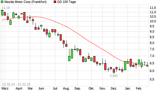 Mit dem Rücksetzer auf 6,27 EUR hat die Mazda Motor-Aktie am 20.02.2025 die 100-Tage-Linie nach unten gekreuzt.