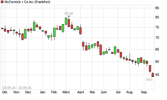 Mit dem Rücksetzer auf 55,00 EUR hat die McCormick-Aktie (ISIN US5797802064) am 22.09.2025 ein neues 5-Jahres-Tief erreicht und damit den Kurs vom 16.09.2025 eingestellt.