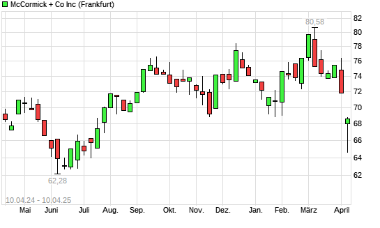 Mit dem Rücksetzer auf 65,20 EUR hat die McCormick-Aktie (ISIN US5797802064) am 09.04.2025 ein neues 6-Monats-Tief erreicht und damit den Kurs vom 08.04.2025 eingestellt.