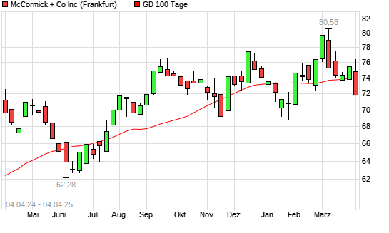 Mit dem Rücksetzer auf 72,86 EUR hat die McCormick-Aktie am 03.04.2025 die 100-Tage-Linie nach unten gekreuzt.