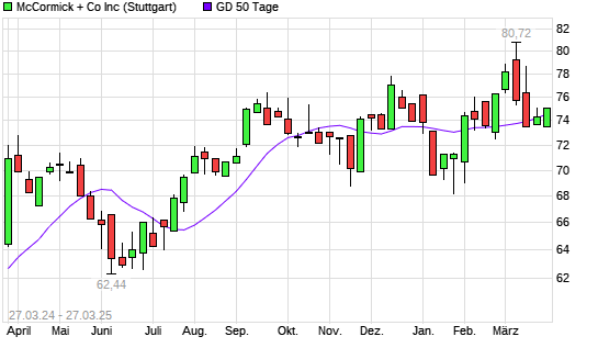 Mit dem Rücksetzer auf 74,08 EUR hat die McCormick-Aktie am 26.03.2025 die 50-Tage-Linie nach unten gekreuzt.