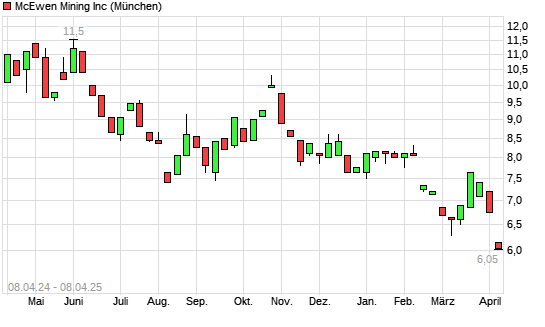 Mit dem Rücksetzer auf 6,00 EUR hat die McEwen Mining-Aktie (ISIN US58039P3055) am 07.04.2025 ein neues 12-Monats-Tief erreicht und damit den Kurs vom 05.03.2025 eingestellt.