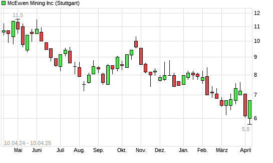 Mit dem Rücksetzer auf 5,90 EUR hat die McEwen Mining-Aktie (ISIN US58039P3055) am 09.04.2025 ein neues 12-Monats-Tief erreicht und damit den Kurs vom 07.04.2025 eingestellt.
