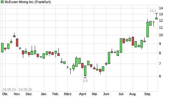 Mit dem Anstieg auf 13,10 EUR hat die McEwen Mining-Aktie (ISIN US58039P3055) am 23.09.2025 ein neues 3-Jahres-Hoch erreicht und damit den Kurs vom 22.09.2025 eingestellt.