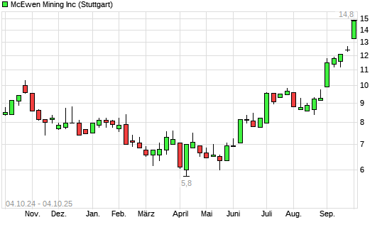 Mit dem Anstieg auf 14,90 EUR hat die McEwen Mining-Aktie (ISIN US58039P3055) am 03.10.2025 ein neues 5-Jahres-Hoch erreicht und damit den Kurs vom 01.10.2025 eingestellt.