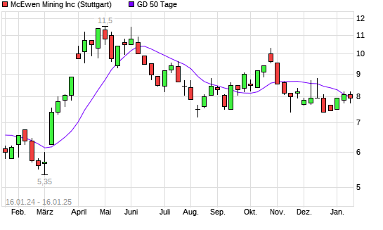 Mit dem Anstieg auf 8,10 EUR hat die McEwen Mining-Aktie am 15.01.2025 die 50-Tage-Linie nach oben gekreuzt.