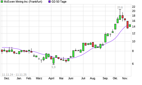 Mit dem Anstieg auf 14,70 EUR hat die McEwen Mining-Aktie am 10.11.2025 die 50-Tage-Linie nach oben gekreuzt.
