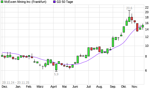 Mit dem Anstieg auf 15,40 EUR hat die McEwen Mining-Aktie am 19.11.2025 die 50-Tage-Linie nach oben gekreuzt.