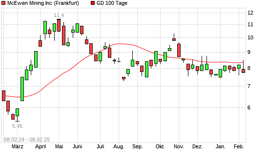 Mit dem Rücksetzer auf 7,75 EUR hat die McEwen Mining-Aktie am 07.02.2025 die 100-Tage-Linie nach unten gekreuzt.