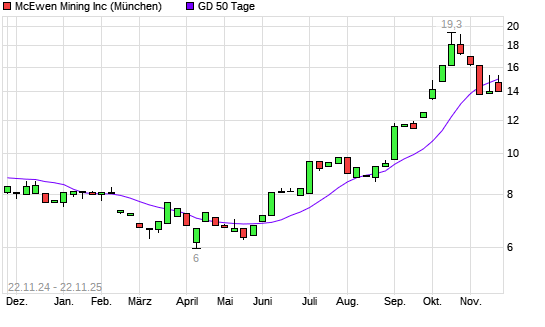 Mit dem Rücksetzer auf 14,00 EUR hat die McEwen Mining-Aktie am 21.11.2025 die 50-Tage-Linie nach unten gekreuzt.