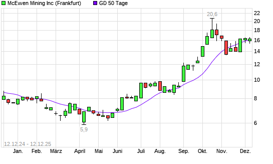 Mit dem Rücksetzer auf 15,90 EUR hat die McEwen Mining-Aktie am 11.12.2025 die 50-Tage-Linie nach unten gekreuzt.
