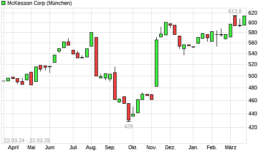 Mit dem Anstieg auf 615,00 EUR hat die McKesson-Aktie (ISIN US58155Q1031) am 21.03.2025 ein neues All-Time-High erreicht und damit den Kurs vom 03.03.2025 eingestellt.
