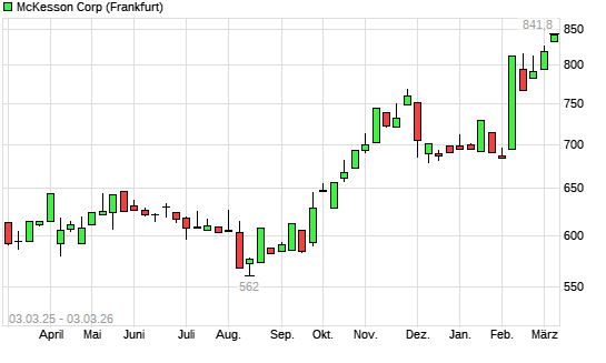 Mit dem Anstieg auf 841,60 EUR hat die McKesson-Aktie (ISIN US58155Q1031) am 02.03.2026 ein neues All-Time-High erreicht und damit den Kurs vom 26.02.2026 eingestellt.