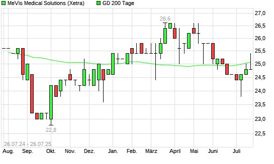Mit dem Rücksetzer auf 24,40 EUR hat die MeVis Medical Solutions-Aktie am 25.07.2025 die 200-Tage-Linie nach unten gekreuzt.