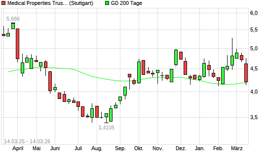 Mit dem Rücksetzer auf 4,20 EUR hat die Medical Properties Trust-Aktie am 13.03.2026 die 200-Tage-Linie nach unten gekreuzt.