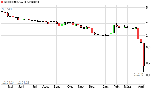 Mit dem Rücksetzer auf 0,17 EUR hat die Medigene-Aktie (ISIN DE000A1X3W00) am 11.04.2025 ein neues All-Time-Low erreicht und damit den Kurs vom 09.04.2025 eingestellt.