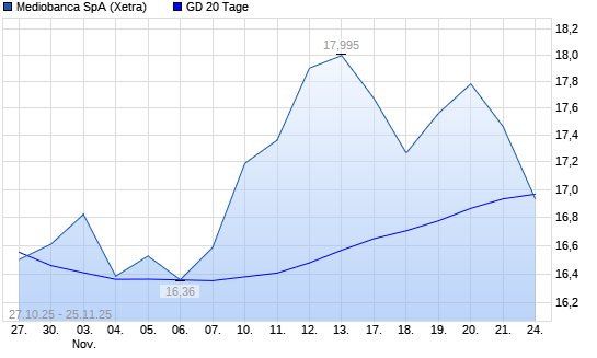 Mit dem Rücksetzer auf 16,87 EUR hat die Mediobanca-Aktie am 24.11.2025 die 20-Tage-Linie nach unten gekreuzt.