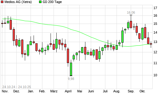 Mit dem Anstieg auf 12,76 EUR hat die Medios-Aktie am 23.10.2025 die 200-Tage-Linie nach oben gekreuzt.