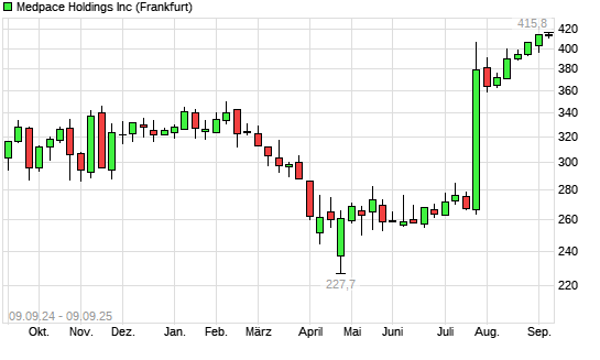 Mit dem Anstieg auf 415,60 EUR hat die Medpace Holdings-Aktie (ISIN US58506Q1094) am 08.09.2025 ein neues 12-Monats-Hoch erreicht und damit den Kurs vom 05.09.2025 eingestellt.