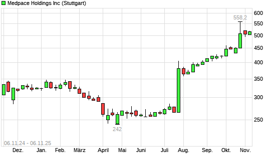 Mit dem Anstieg auf 519,40 EUR hat die Medpace Holdings-Aktie (ISIN US58506Q1094) am 05.11.2025 ein neues All-Time-High erreicht und damit den Kurs vom 04.11.2025 eingestellt.