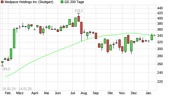 Mit dem Anstieg auf 342,90 EUR hat die Medpace Holdings-Aktie am 13.01.2025 die 200-Tage-Linie nach oben gekreuzt.