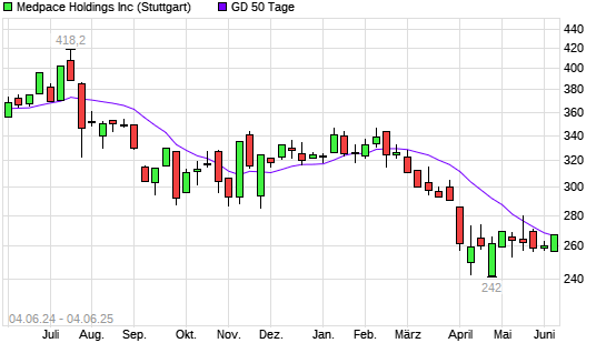 Mit dem Anstieg auf 267,90 EUR hat die Medpace Holdings-Aktie am 03.06.2025 die 50-Tage-Linie nach oben gekreuzt.