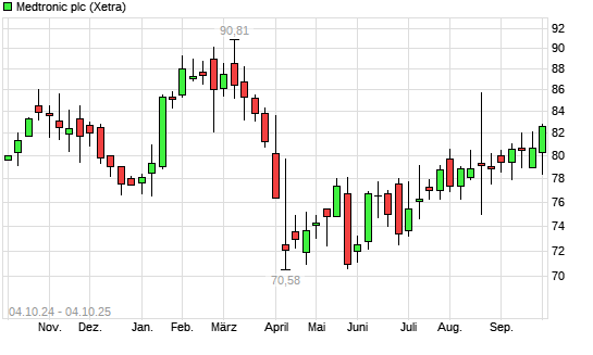 Mit dem Anstieg auf 82,85 EUR hat die Medtronic-Aktie (ISIN IE00BTN1Y115) am 03.10.2025 ein neues 6-Monats-Hoch erreicht und damit den Kurs vom 25.09.2025 eingestellt.
