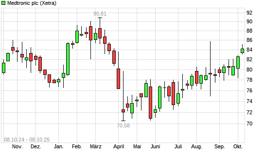 Mit dem Anstieg auf 84,44 EUR hat die Medtronic-Aktie (ISIN IE00BTN1Y115) am 07.10.2025 ein neues 6-Monats-Hoch erreicht und damit den Kurs vom 06.10.2025 eingestellt.