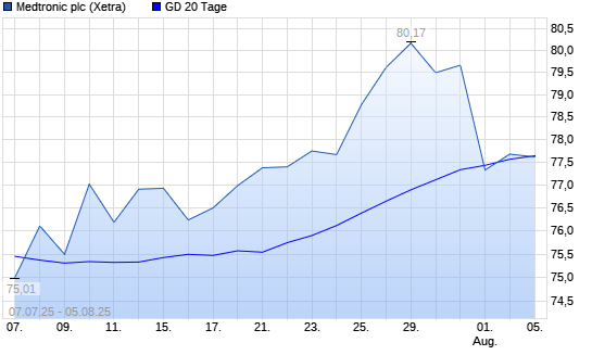 Mit dem Rücksetzer auf 77,54 EUR hat die Medtronic-Aktie am 04.08.2025 die 20-Tage-Linie nach unten gekreuzt.